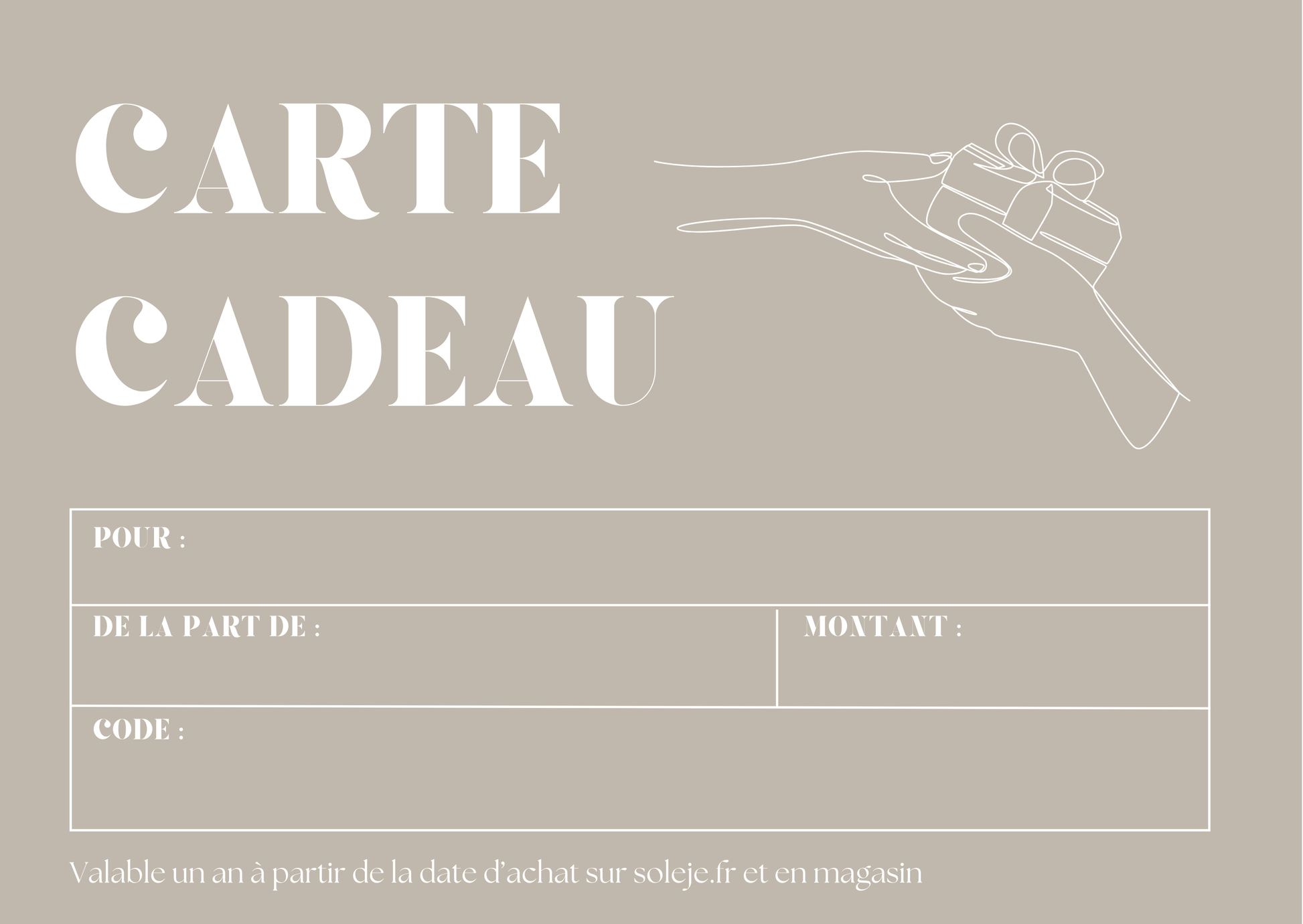 Carte Cadeau à valoir 1 ans à partir de la date d'achat sur toute la boutique Solèje.fr