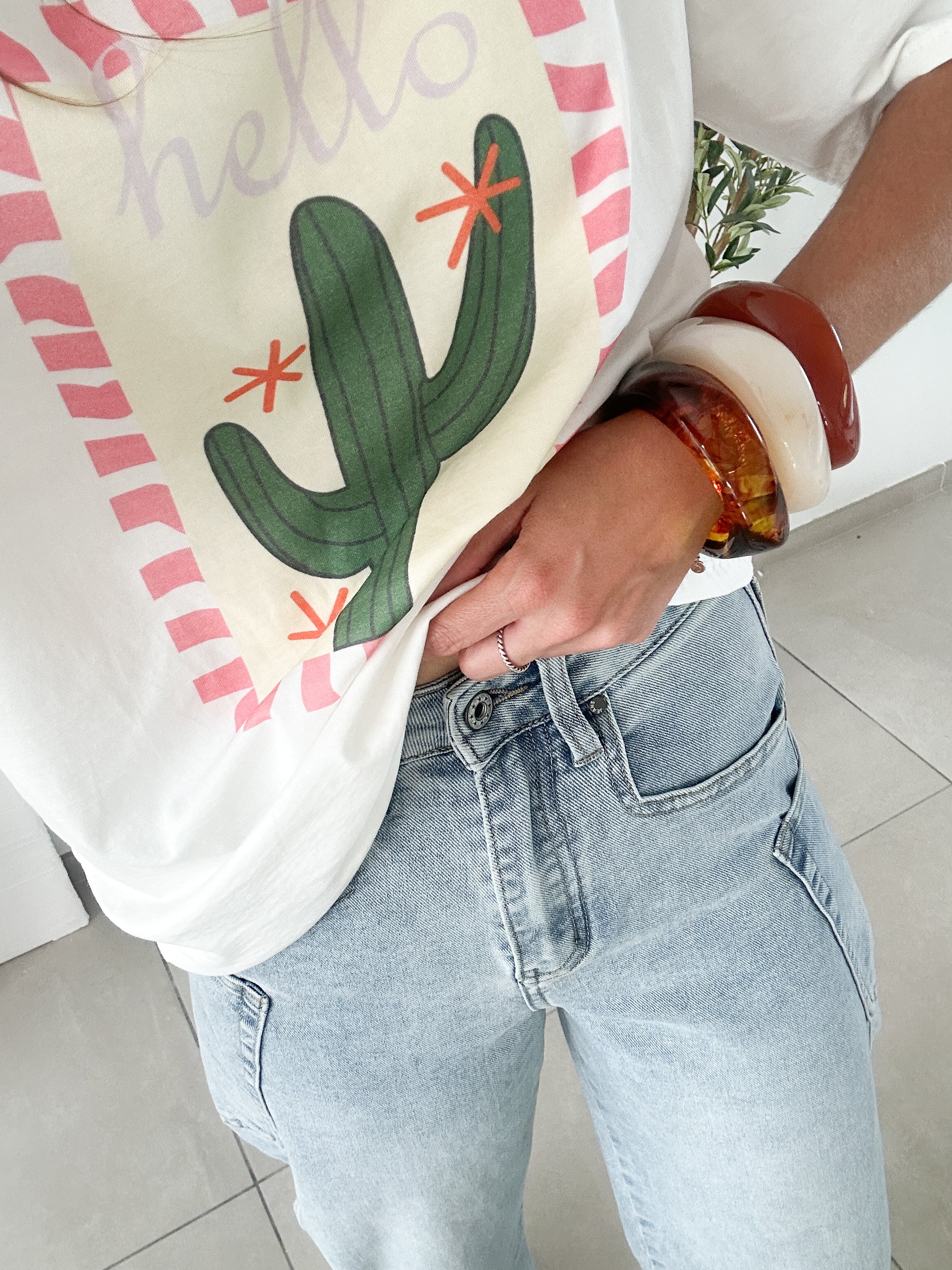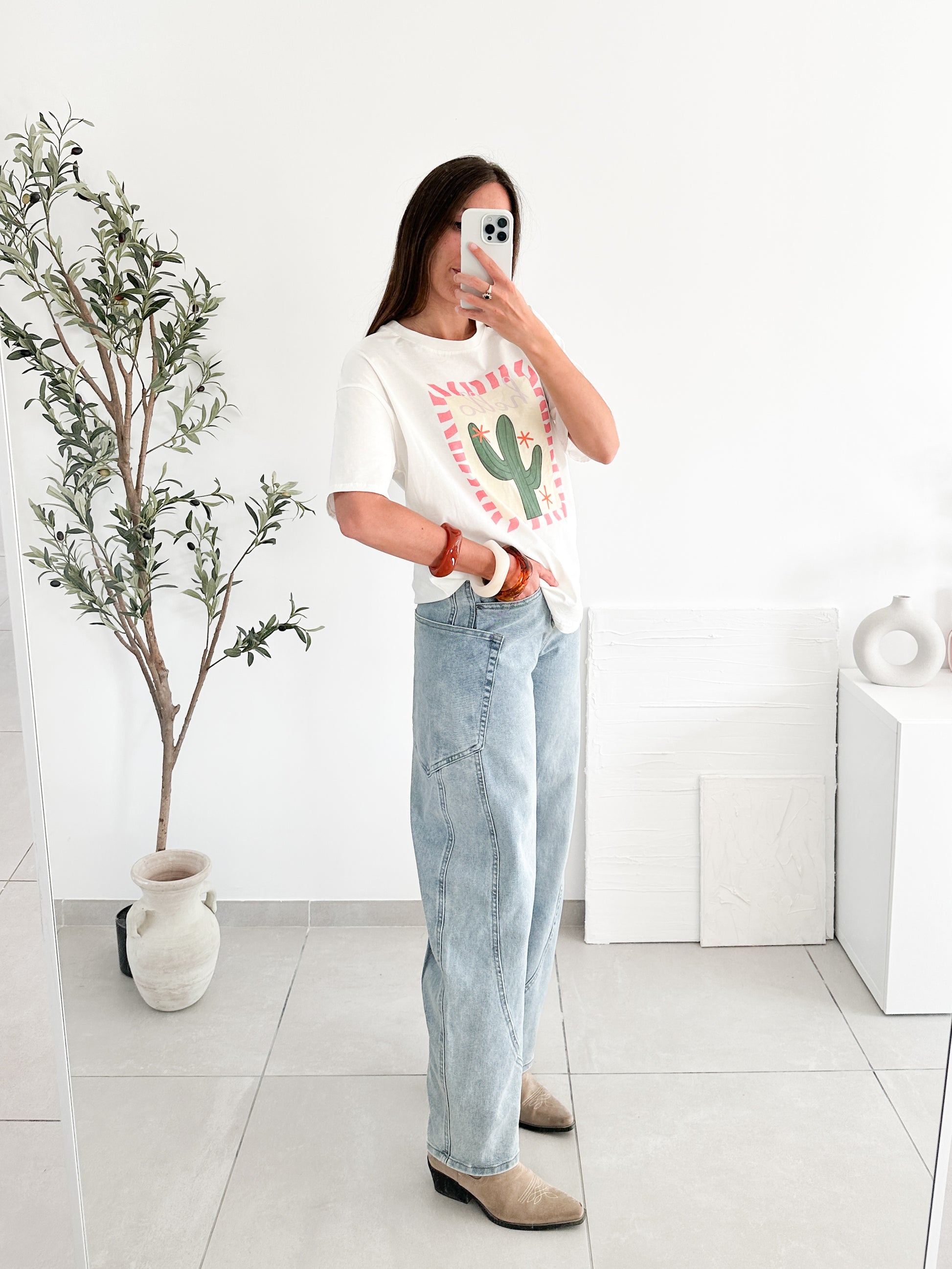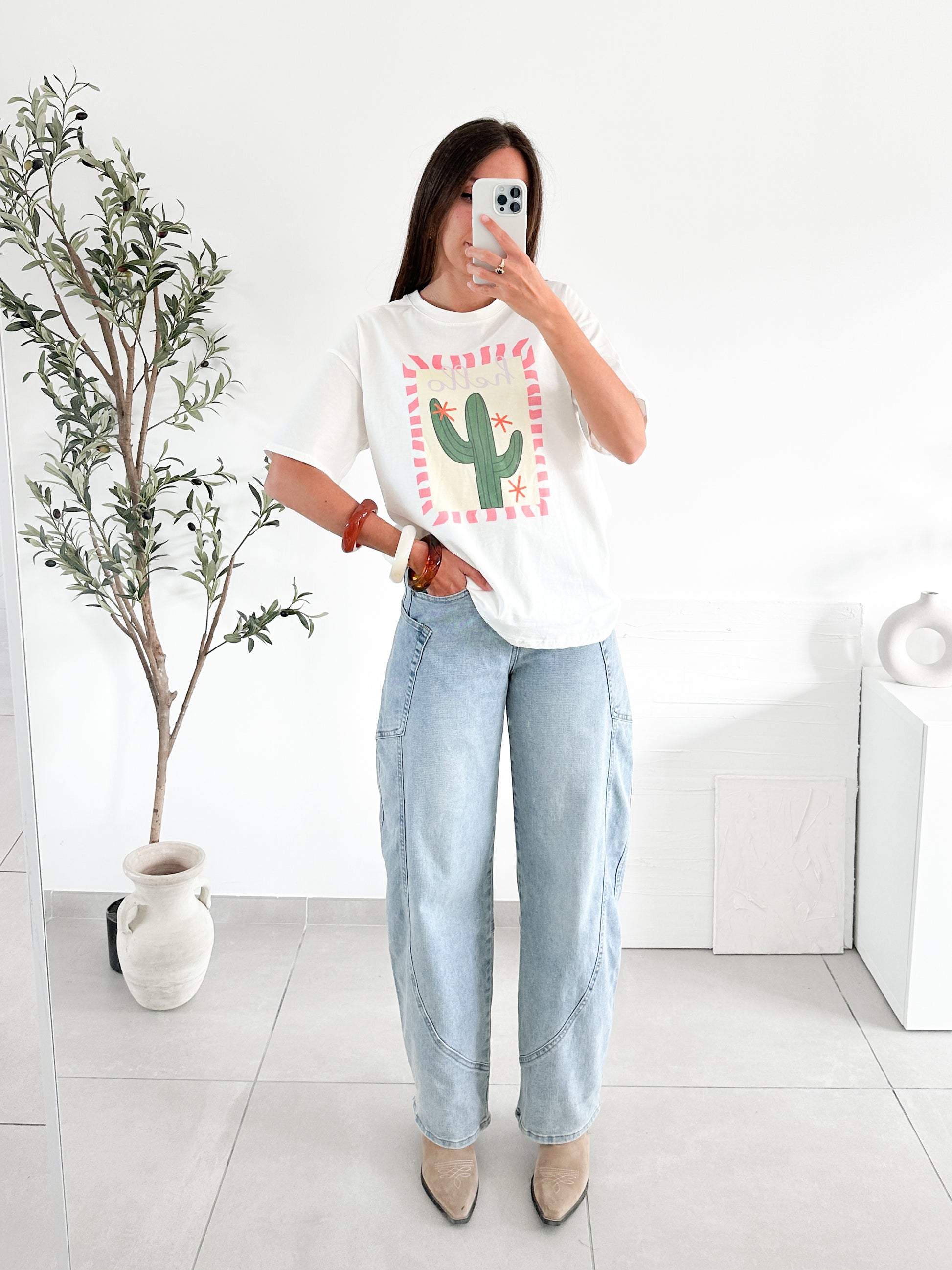 Jean à la coupe barre, arrondie sur les côtés